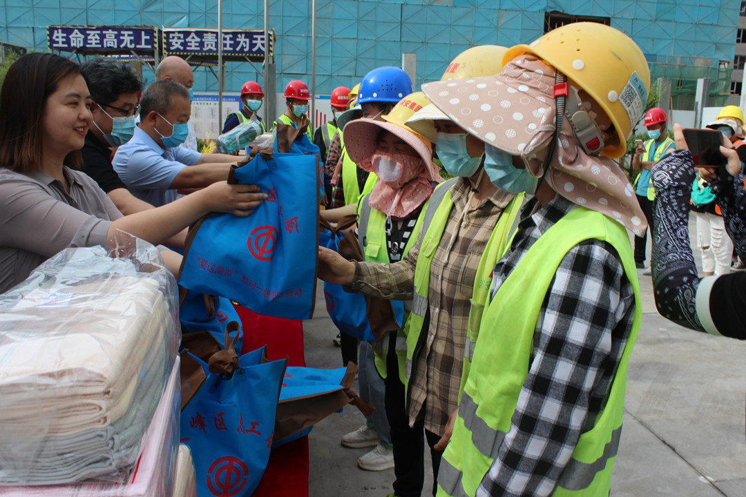 活動(dòng)現(xiàn)場(chǎng),工會(huì)和集團(tuán)公司領(lǐng)導(dǎo)逐一將香皂、毛巾、水杯、茶葉等防暑降溫用品送到每位一線建筑工人的手中,猶如一股清泉流淌在工人的心中,極大地鼓舞了士氣、凝聚了力量,為夏日高溫有序施工提供了安全保障。